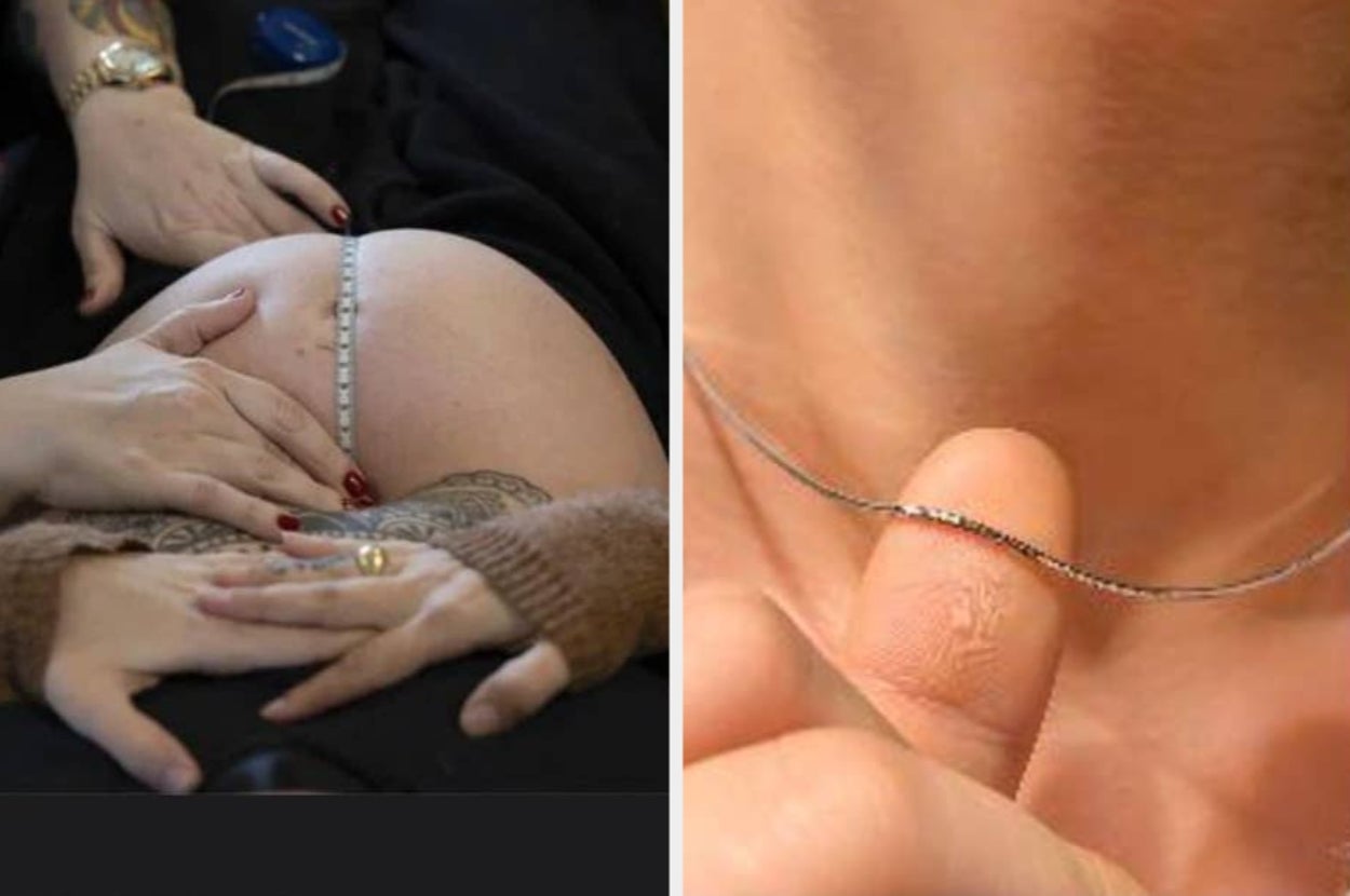 It is a person holding a necklace with their thumb: