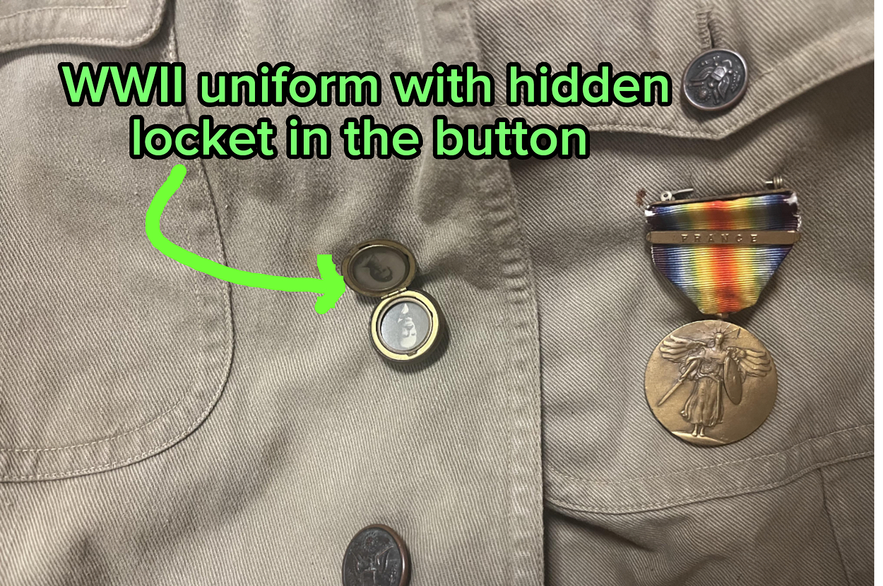 This WWII uniform, in which this button on top is actually a secret, hidden locket: