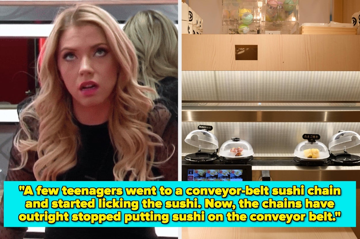 “In Japan, a couple of teenage hooligans went to a Kaitenzushi chain (conveyor-belt sushi) and started licking the sushi and condiments while leaving them on the conveyor belt, all the while filming this for TikTok. Now, half of all the Kaitenzushi chains have outright stopped having the sushi on the conveyor belt to be taken.”